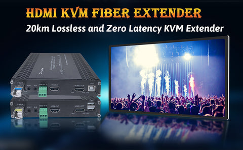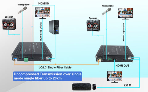 - 【Transmit over Fiber 20KM】KVM Fiber Extender transmits Uncompressed HDMI video signals up to 20km over signal over single core single mode fiber optic cable, At the same time, the KVM Extender support external stereo audio bi-directional transmission, you will be absorbed in Real-time intercom with others on the other side far away