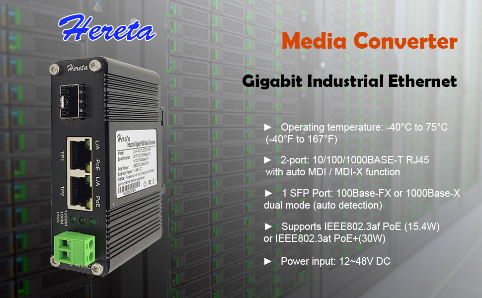 Gigabit Industrial Ethernet Media Converter POE+ 30W Aluminum Case 12~48V DC Input Power