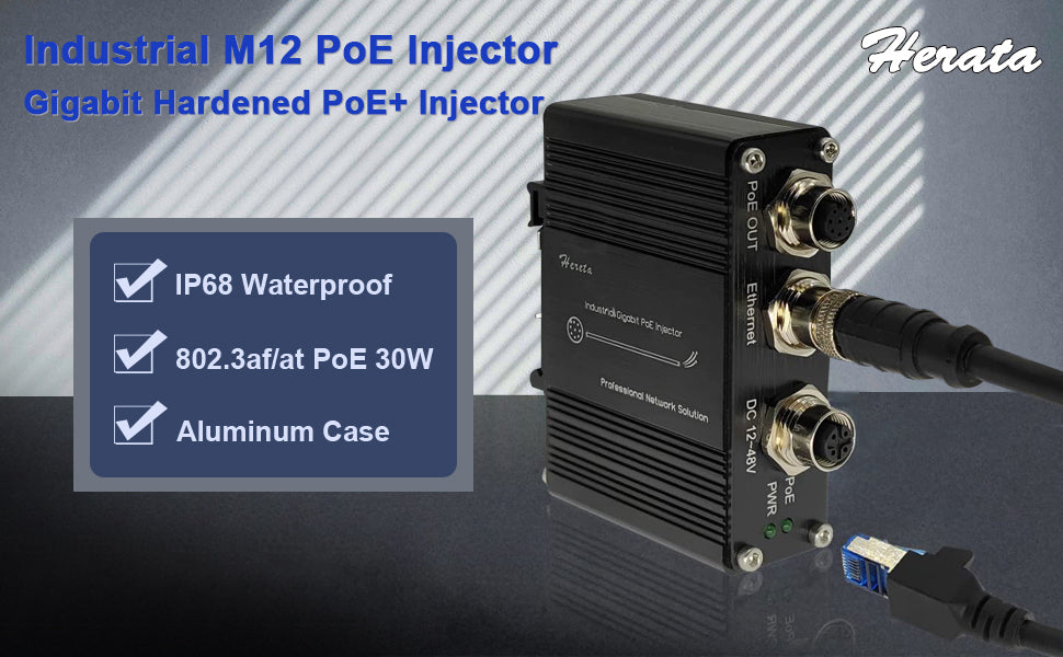 Hardened M12 Industrial Gigabit PoE+ Injector Waterproof IP68 Interface 12-48VDC Input Support The PoE IEEE 802.3 af/at 30W Power Sourcing Equipment