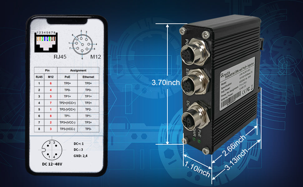 LNK-INJ301-M12 provides an integrated power solution with a wide range voltage of 12~48VDC for high