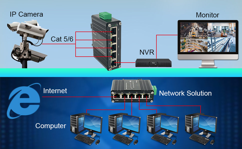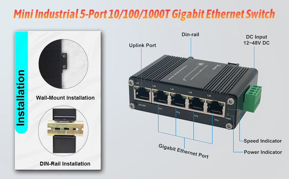 Industrial Gigabit Ethernet PoE+ Switch 5-Port 10/100/1000BASE-T Auto-MDI/MDI-X Half/Full Duplex Compact 30W PoE+ Ethernet Switch 12~48VDC Wide Range Power Input